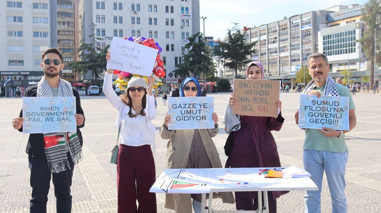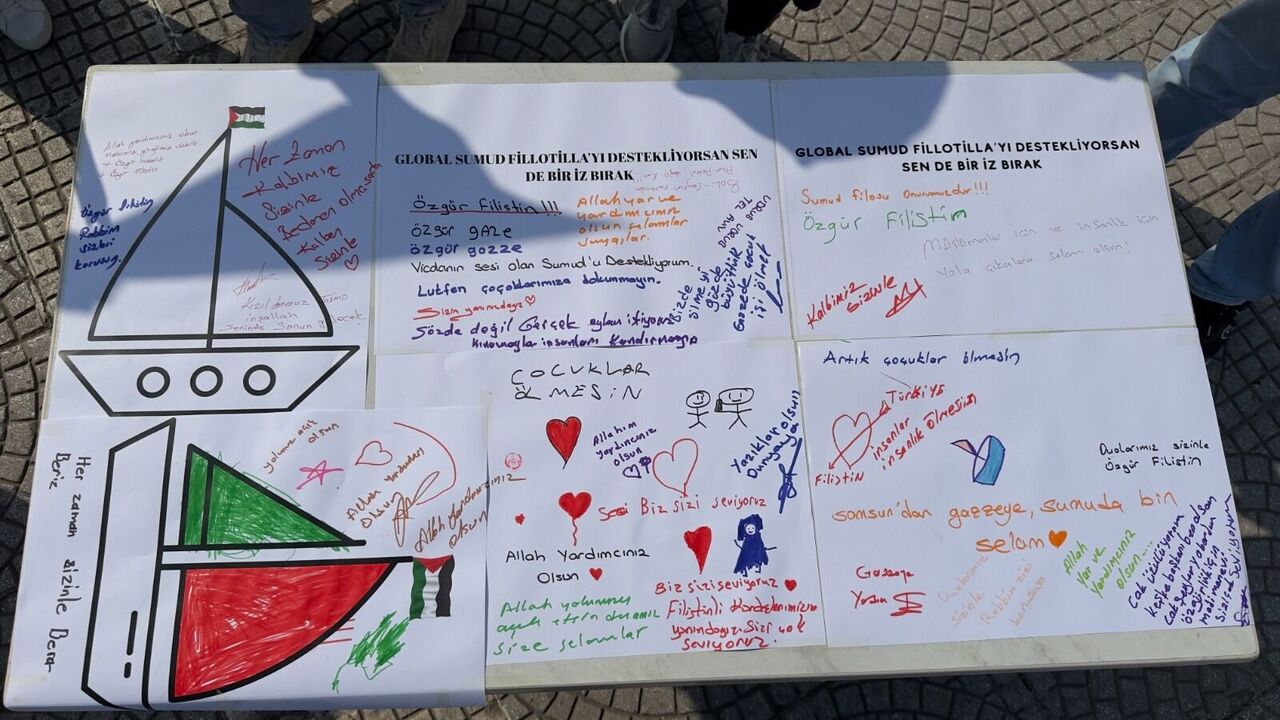 Gazze’ye destek amacıyla denizden yola çıkan ve abluka altındaki bölgeye insani yardım ulaştırmayı hedefleyen Küresel Sumud Filosu'na Samsun'dan destek yağdı. 7'den 70'e çok sayıda vatandaş, yazdıkları mesajlar ve dualar, çizdikleri resimlerle hem umut taşıyan filodaki aktivistlerin hem de Filistin halkının yanlarında olduklarını belirttiler.