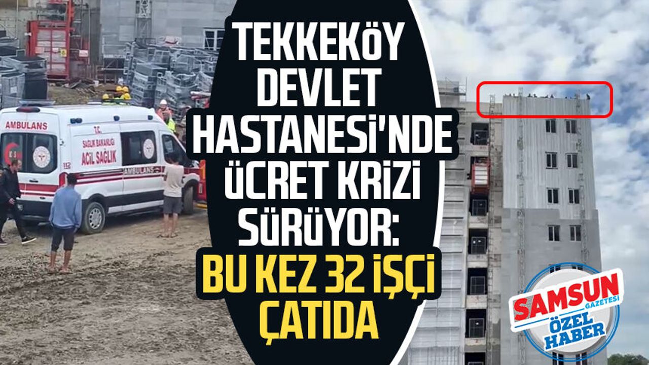 Samsun'un Tekkeköy ilçesinde yapımı devam eden Tekkeköy Devlet Hastanesi inşaatında çalışan 32 işçi, alt taşeron firmanın uzun süredir ücretlerini yatırmadığını iddia ederek sabah saatlerinde çatıya çıktığı öğrenildi. Yüksek binanın üzerinde topluca eylem yapan işçileri görenler durumu polise bildirdi. Bunun üzerine bölgeye çok sayıda polis, sağlık ve itfaiye ekibi sevk edildi.