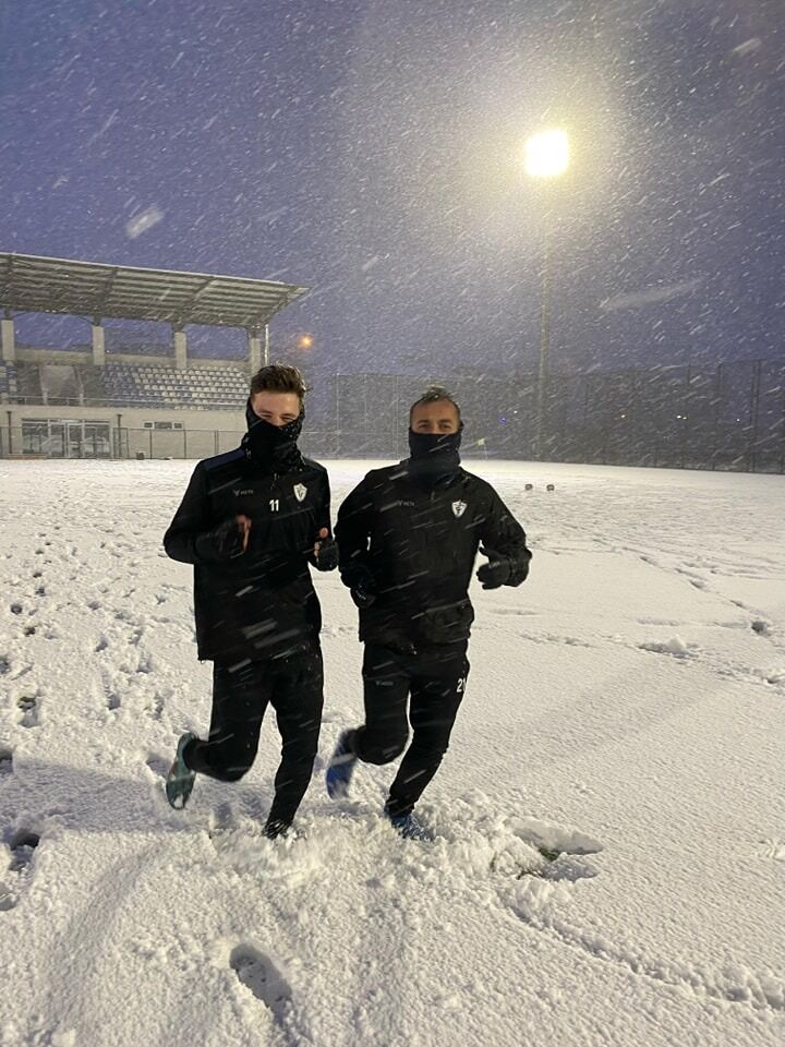 Play-Off maçlarına en iyi şekilde hazırlanmak isteyen takım, antrenmanlarını yoğun kar yağışı altında gerçekleştirdi.