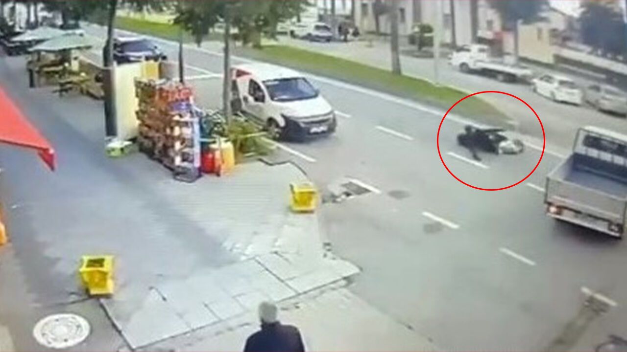 Çarpmamak için ani fren yapan genç sürücünün motosikleti kayarak kontrolünü kaybetti ve kamyonete yandan çarptı. Kaza anı çevredeki bir iş yerinin güvenlik kamerasına da yansıdı.