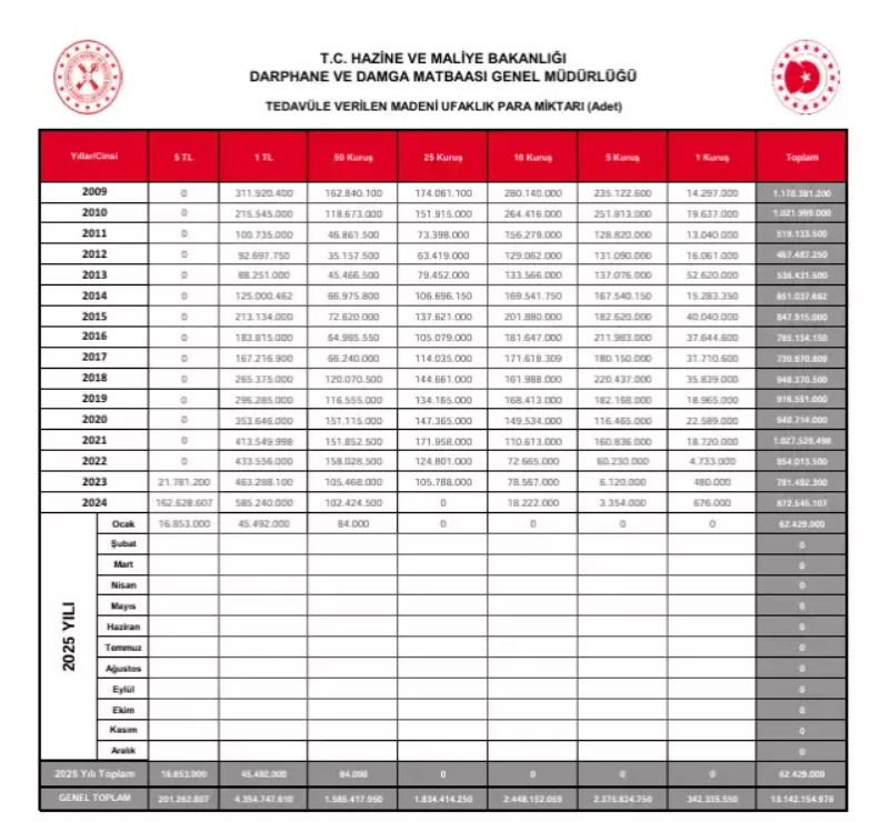 2025 yılı Ocak ayında 84 bin adet 50 kuruş, 45 milyon 492 bin adet bir TL ve 16 milyon 853 bin adet beş TL olmak üzere toplam 62 milyon 429 bin adet madeni para piyasaya çıkarıldı.