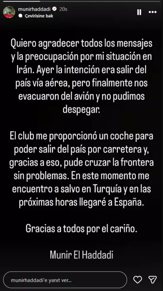 İran Ligi ekiplerinden Esteghlal FC forması giyen eski Barcelona oyuncusu Munir El Haddadi, ülkede artan güvenlik endişeleri nedeniyle İran’dan ayrıldı. 30 yaşındaki Faslı futbolcu, kara yoluyla Türkiye’ye geçtiğini açıkladı.