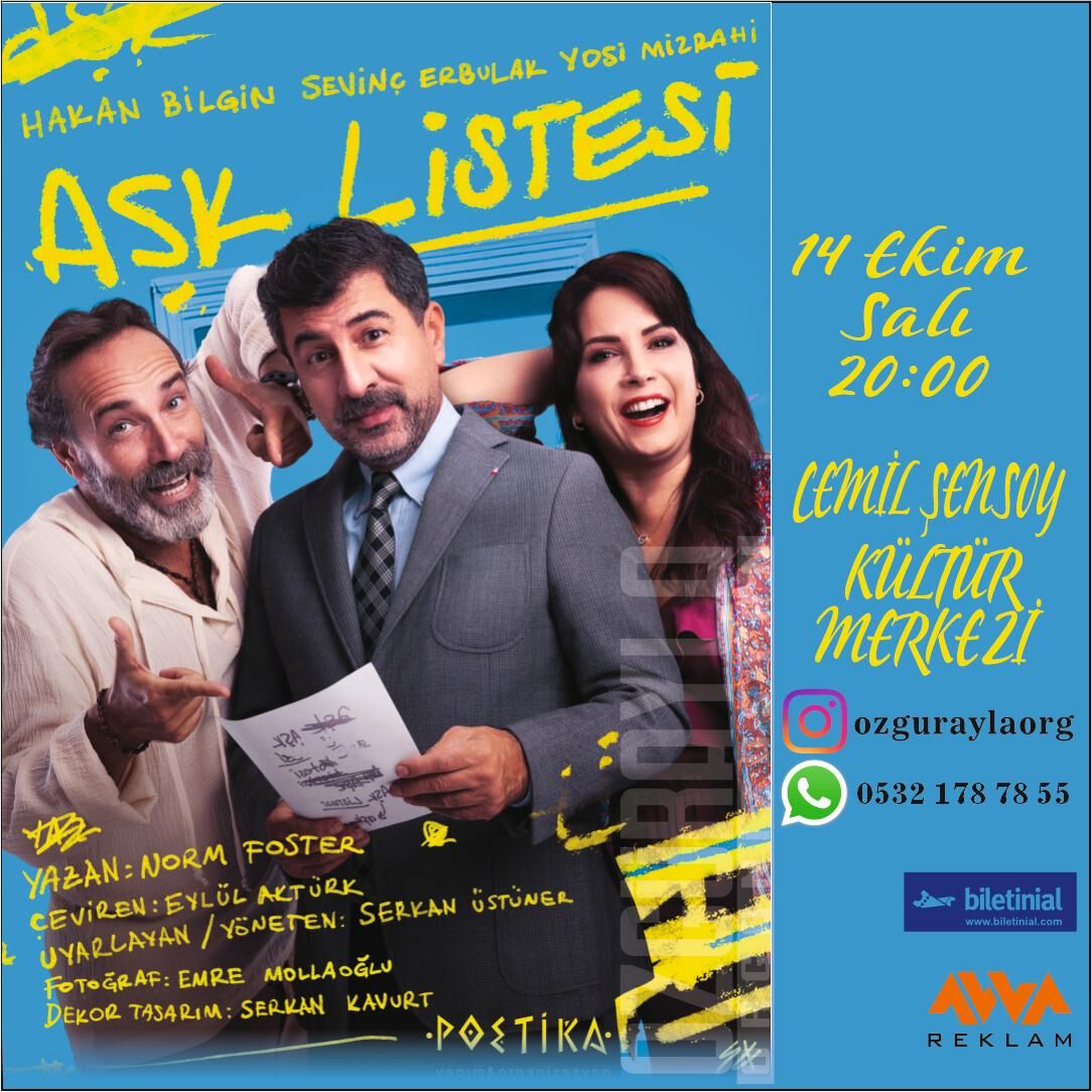 Serkan Üstünel'in yönettiği oyunda Sevinç Erbulak ve Yosi Mizrahi ile birlikte rol alan ünlü sanatçı, 14 Ekim Salı günü saat 20.00'de Cemil Şensoy Kültür Merkezi'nde sergilenecek "Aşk Listesi"ne Çarşambalıları davet etti.