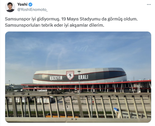 Yoshi Enomoto, ayrıca Samsun 19 Mayıs Stadyumu’nu da paylaşarak, "Samsunspor iyi gidiyormuş. 19 Mayıs Stadyumu’nu da görmüş oldum. Samsunsporluları tebrik eder, iyi akşamlar dilerim." şeklinde bir mesaj paylaştı.