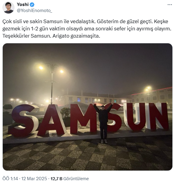 STAND UP gösterisi için Samsun’a gelen Yoshi, gösterisinin ardından sosyal medya hesaplarından yaptığı paylaşımla takipçilerine seslendi. "Çok sisli ve sakin Samsun ile vedalaştık. Gösterim de güzel geçti. Keşke gezmek için 1-2 gün vaktim olsaydı ama sonraki sefer için ayırmış olayım. Teşekkürler Samsun. Arigato gozaimaşita." ifadelerini kullanan Yoshi, şehri gezme fırsatının olmadığını belirtti.