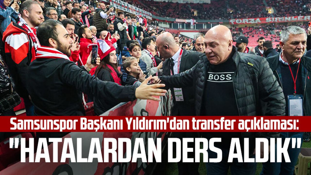 Samsunspor Yılport Samsunspor Başkanı Yüksel Yıldırım'dan transfer açıklaması: "Hatalardan ders aldık" 22.06.2023 - 19:28 22.06.2023 - 19:28 Abone Ol Gelişmelerden haberdar olmak istiyor musunuz? Google News’te Samsun Gazetesi | Samsun Haber | Samsun Haberleri sitemize abone olun. Abone Ol