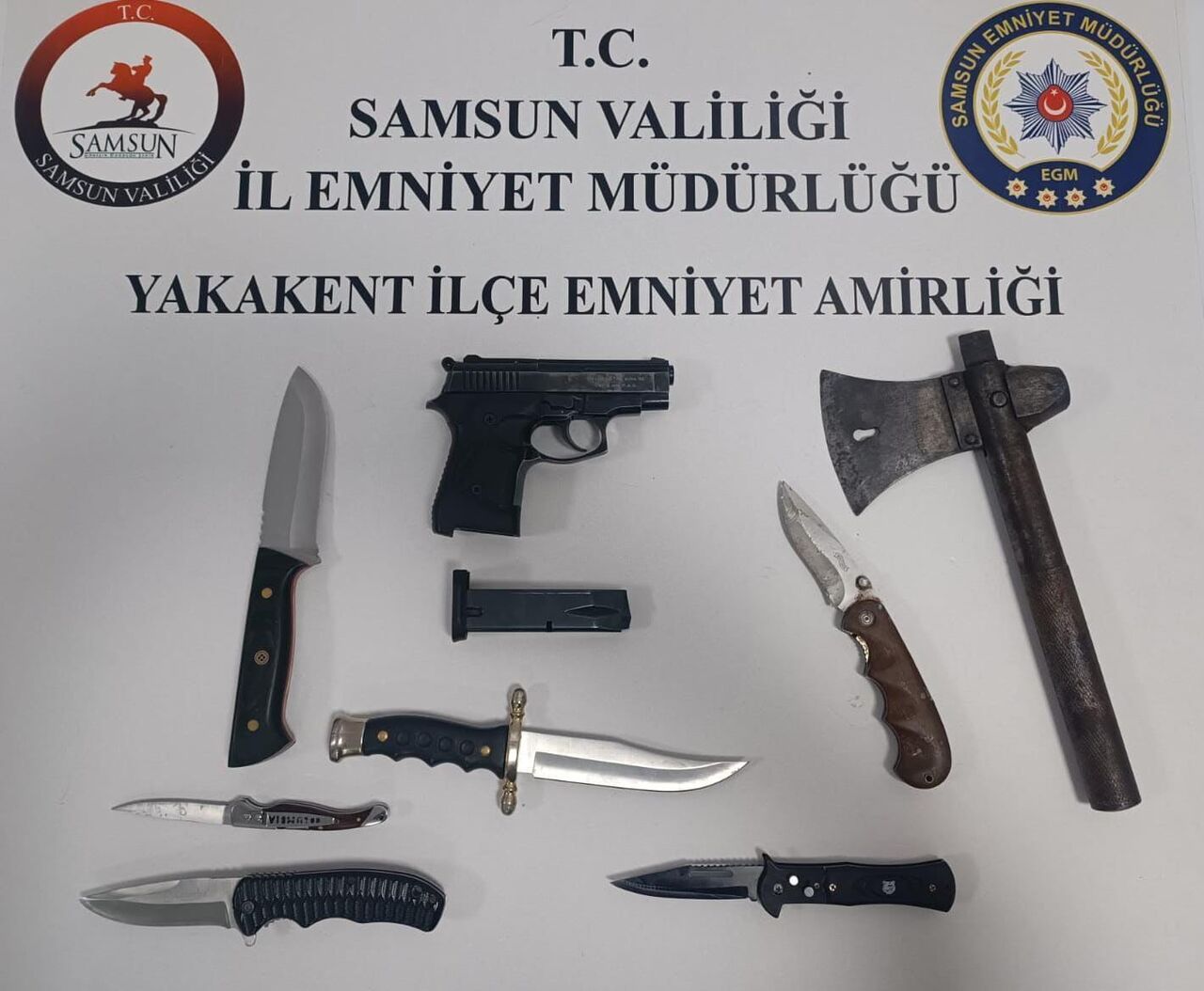 Araçlar ve şahıslar üzerinde yapılan aramalarda, bir kurusıkı tabanca, 6 bıçak ile bir 1 balta ele geçirildi.