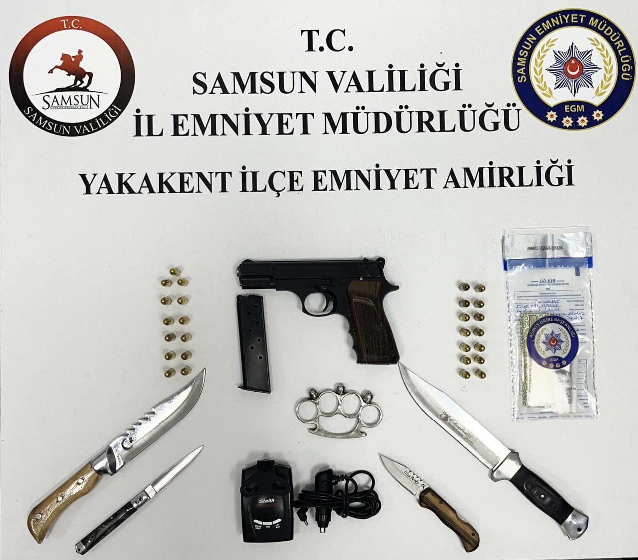 Denetimlerde: 1 adet 9 mm ruhsatsız tabanca ve 27 adet fişek, 1 adet radar tespit cihazı, 1 adet esrarlı sigara, 10 adet sentetik ecza, 4 adet kesici alet (bıçak), 1 adet muşta ele geçirildi.