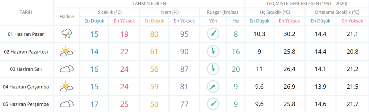 5 Haziran Perşembe günü gökyüzü yeniden kapanıyor. Çok bulutlu hava eşliğinde sıcaklık 17 ile 25 derece arasında değişecek. Nem oranı düşse de (%77), bulutlar güneşin önüne geçmeye devam edecek.