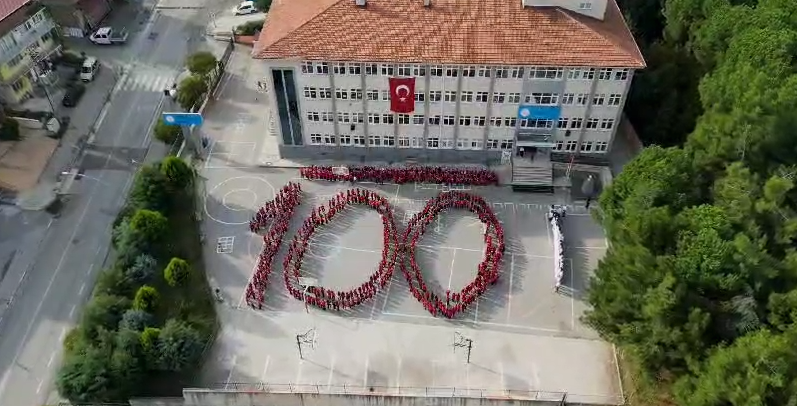 Öğrencilerin okul bahçesinde oluşturduğu koreografi, havadan dron ile görüntülendi.