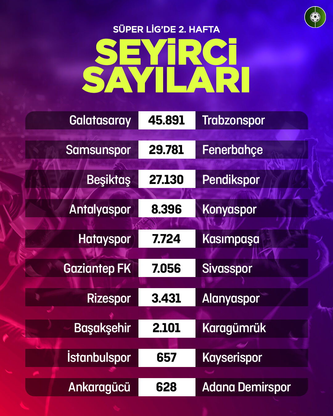 Trendyol Süper Lig’in ikinci haftasında seyirci sayıları açıklandı. Galatasaray’ın, Trabzonspor’u ağırladığı maçı 45 bin 891 taraftar statta izledi. Ligin ikinci sırasında Yılport Samsunspor’un, Fenerbahçe’yi konuk ettiği maç yer aldı. Bu maçı ise 29 bin 781 taraftar Samsun 19 Mayıs Stadı’nda izledi.