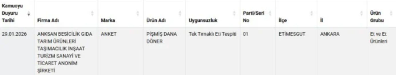 Bakanlık analizlerine göre, etiketinde “Anket Pişmiş Dana Döner” ibaresi bulunan üründe tek tırnaklı hayvan eti tespit edildi. Ürünün, mevzuata aykırı şekilde farklı bir et türü içermesine rağmen dana döner adıyla satışa sunulduğu bildirildi.
