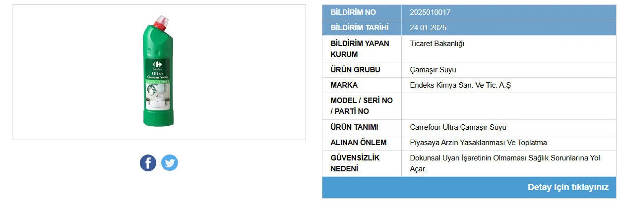 Ticaret Bakanlığı, zincir marketlerde satılan bazı çamaşır sularının toplatıldığını duyurdu. Bakanlık, Güvensiz Ürün Bilgi Sistemi (GÜBİS) üzerinden yaptığı bildirimle, Carrefour markalı ultra çamaşır suyunun sağlık riski taşıdığı gerekçesiyle satıştan kaldırıldığını açıkladı.