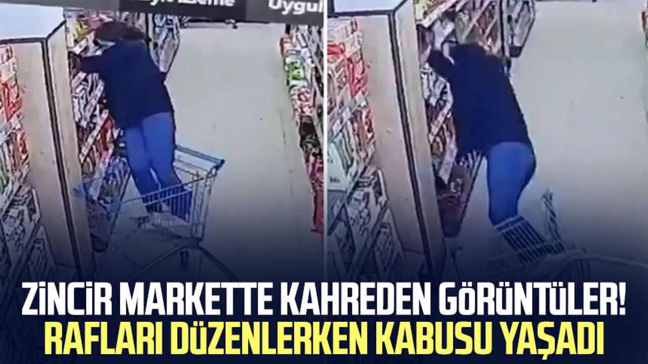 Düşmemek için raflara tutunmaya çalışan genç kadın başarılı olamadı, O anları marketin güvenlik kamerası kaydetti.